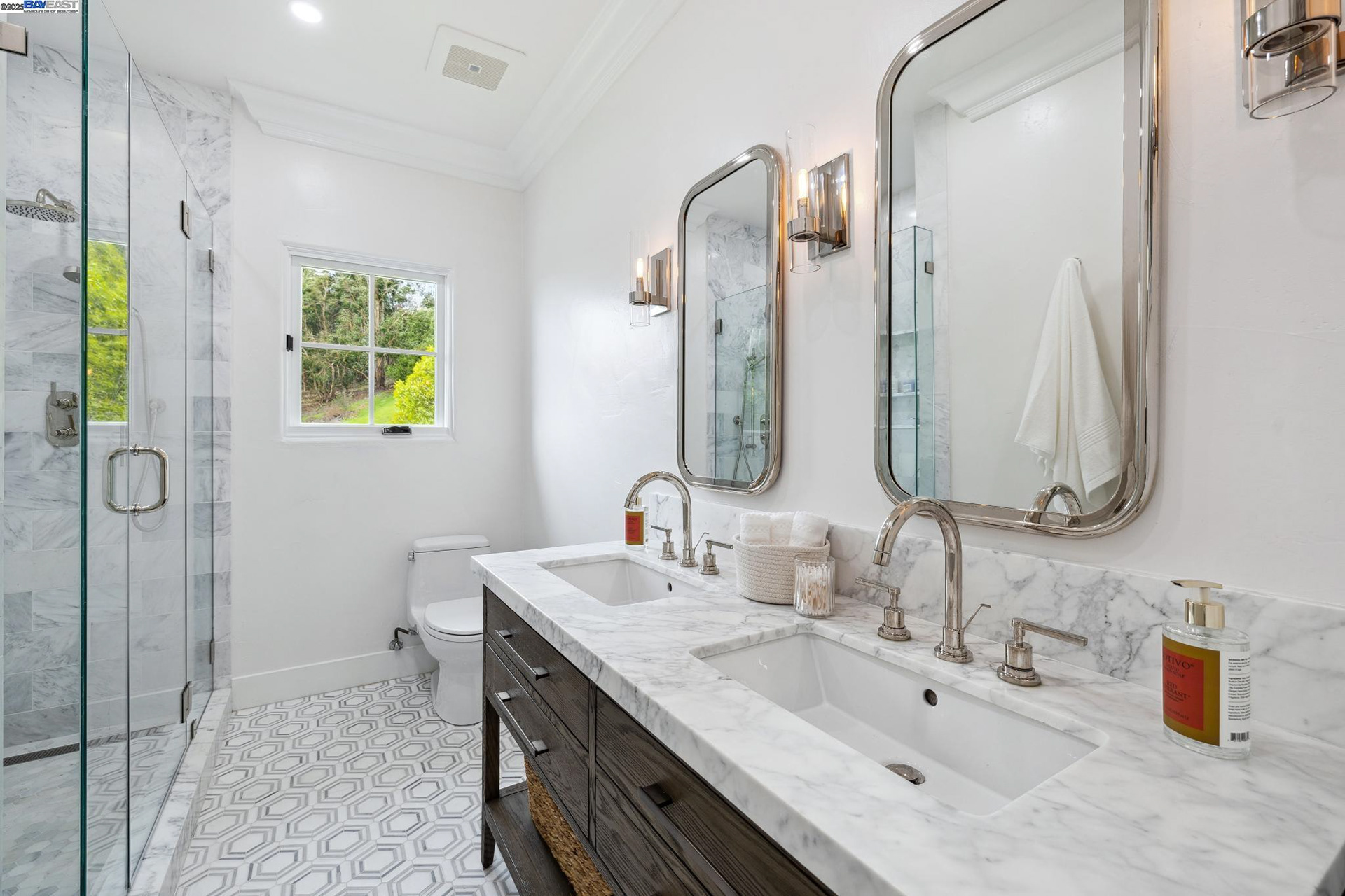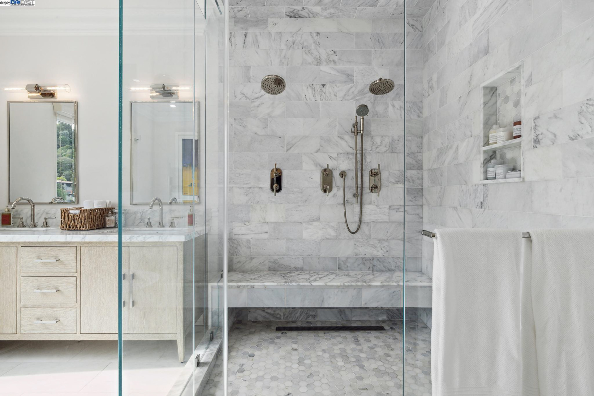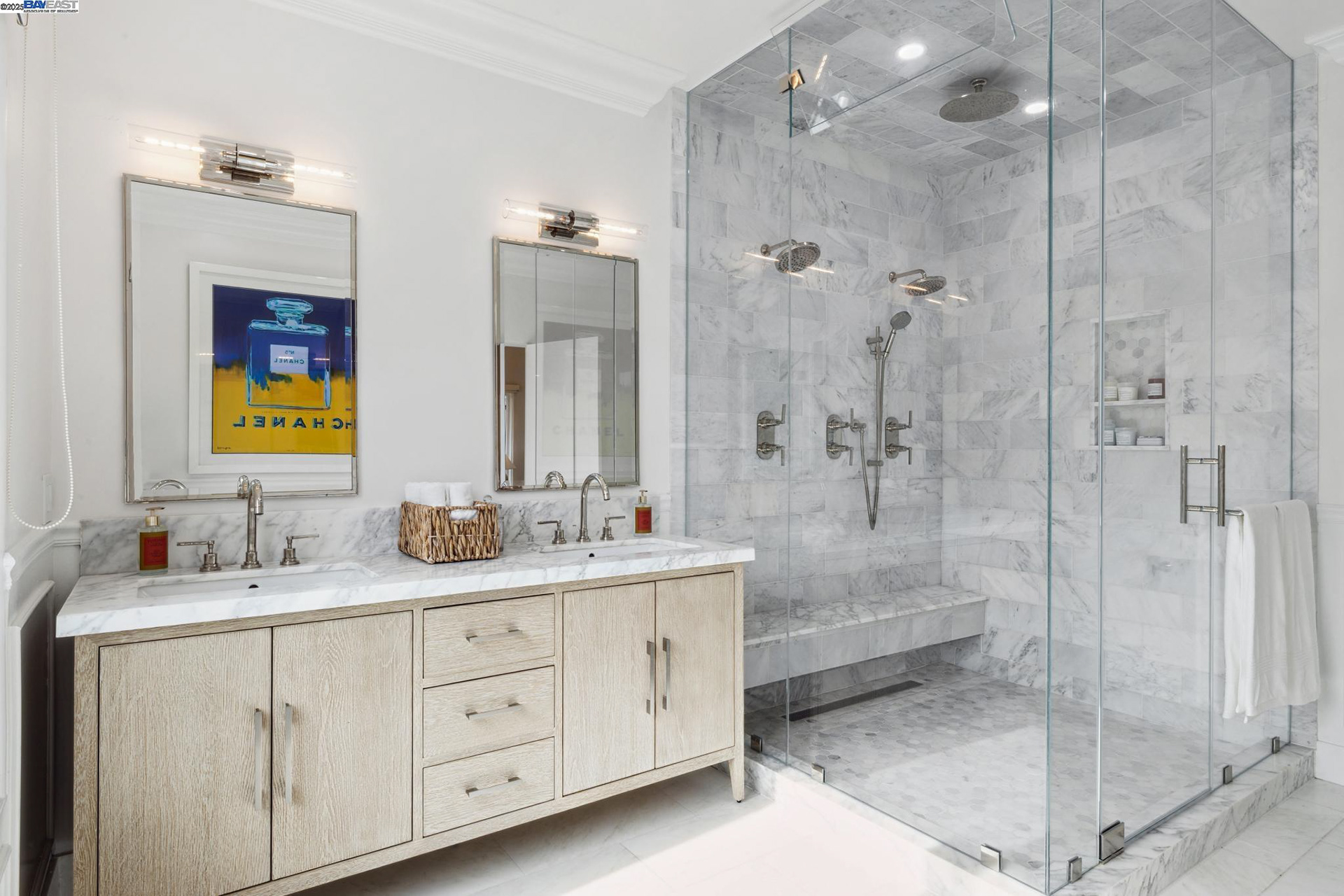 - Luxurious Primary Suite: Spa-like marble bath, steam shower